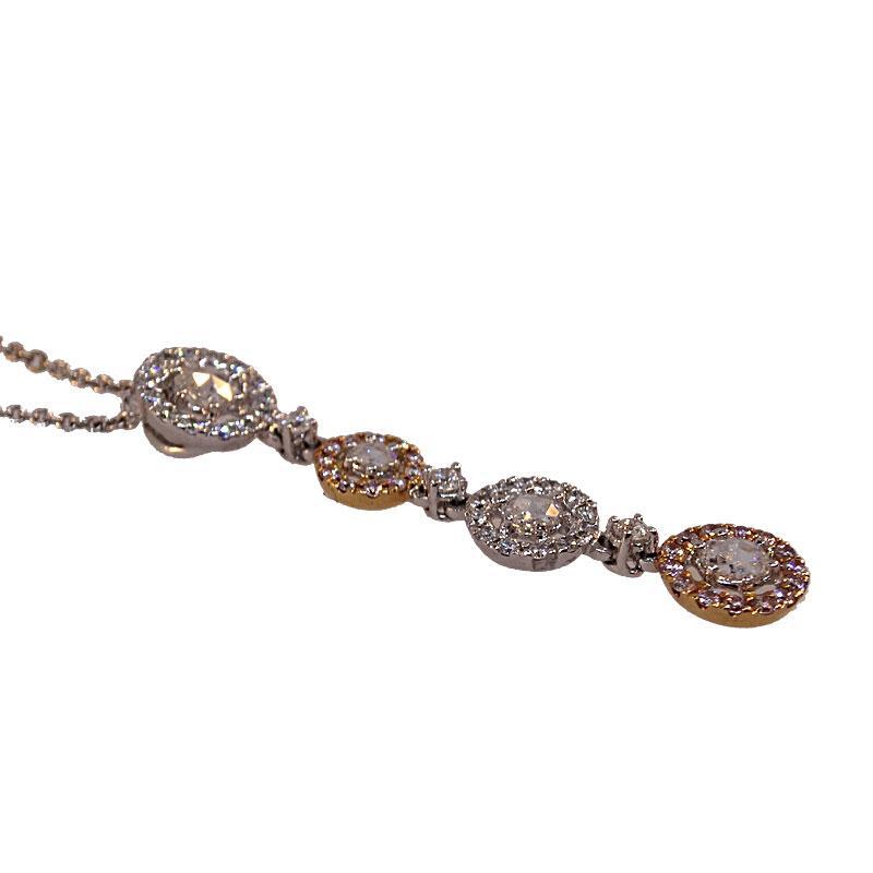 18kt white and rose gold with rose cut white diamonds (2) and pink diamonds (2.) Alternating the rose cut stones are pink and white round diamonds. This dazzling design is perfect for anyone who wants to be pretty in pink! (white diamonds .33ctw, pink diamonds .20, rose cut diamonds .36ctw)