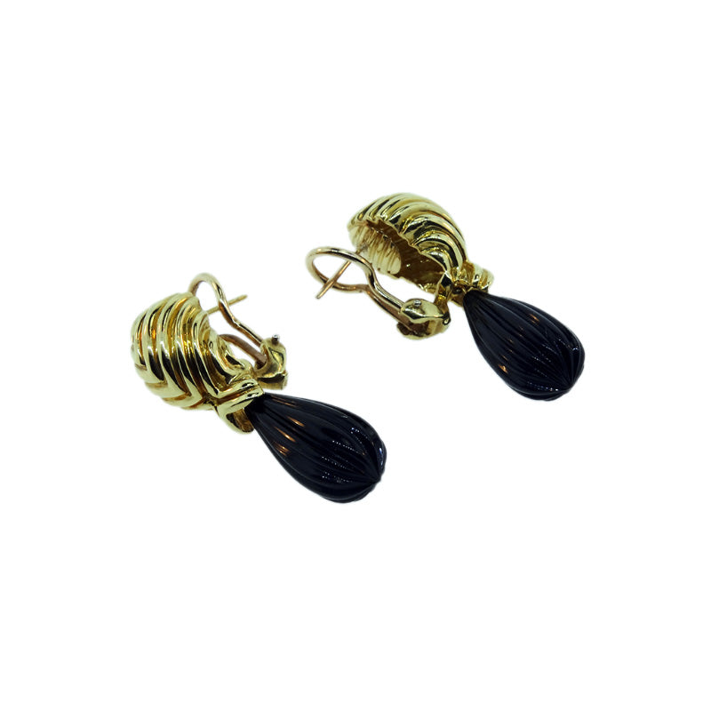 Make a bold statement in these carved 18kt yellow gold and onyx earrings.