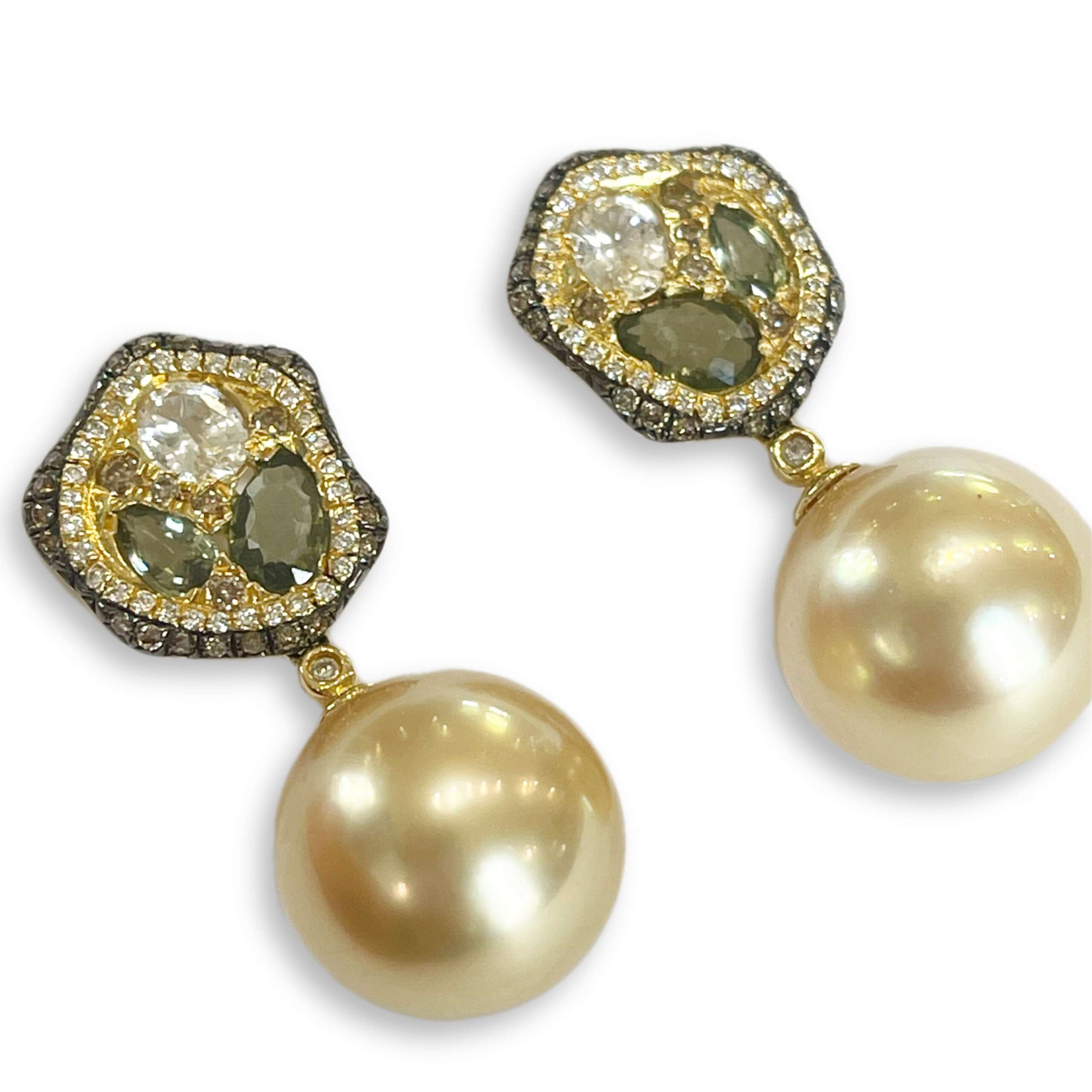 Gold pearl, green sapphire and diamond earrings. 18K-.20CT GS1.73CT BD.41C
