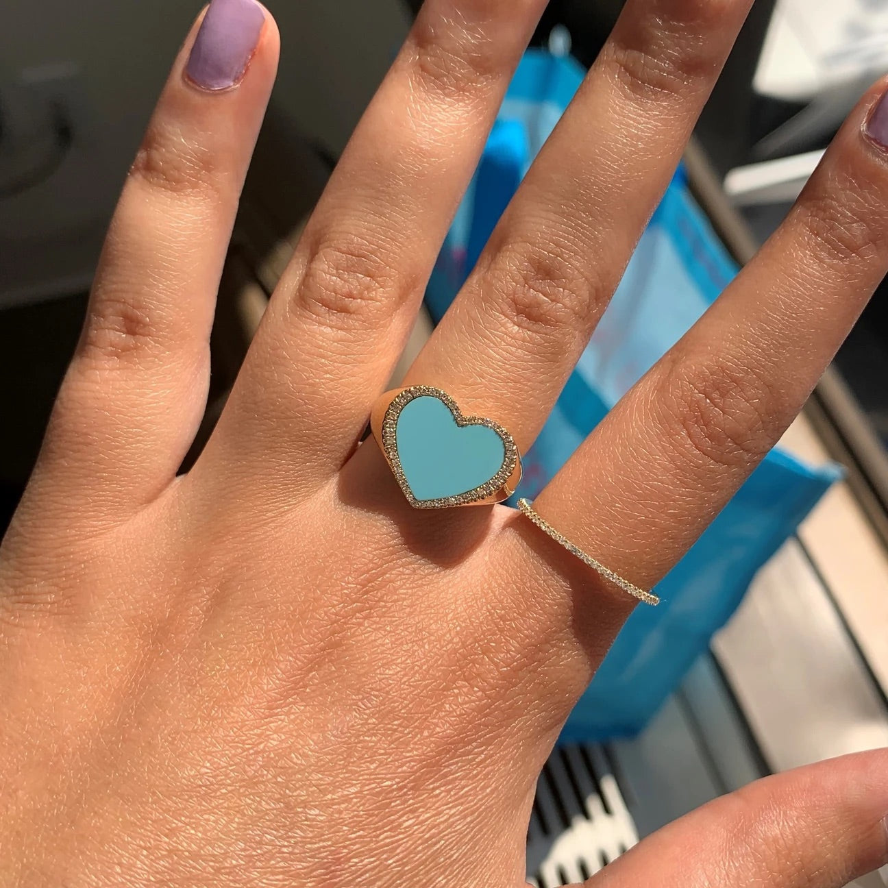 This Gorgeous Heart Shape Ring features a beautiful Blue Heart Shape Turquoise 1.64 ct. surrounded with a row of approximately 0.11 ct of round Diamonds, crafted of 14K Yellow Gold. This ring can be sized by a jeweler one size up or down. Size 5.75